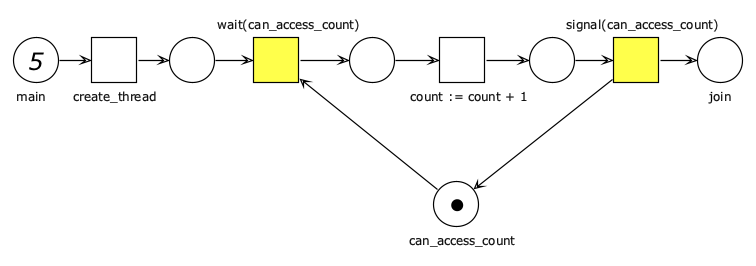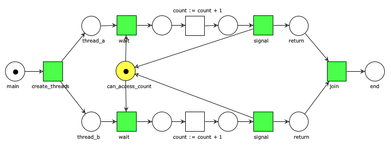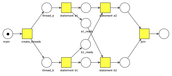 Simule una carrera de relevos, donde los competidores son procesos en equipos. Cada equipo consta de dos corredores. Un corredor tomará la estafeta (en inglés, baton) y se posicionará en la línea de salida. El otro corredor esperará en la mitad de la pista a que el primer corredor llegue y le transfiera la estafeta. En tal momento, el segundo corredor seguirá a toda velocidad hasta alcanzar la meta.